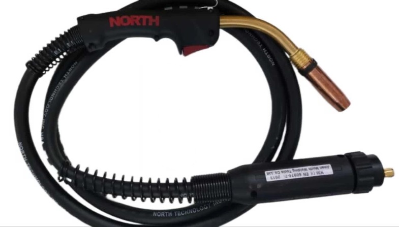 The North MIG Torch 36KD is a specialized welding torch designed for use in MIG (Metal Inert Gas) welding, typically suited for heavy-duty industrial applications. The 36KD is built with a focus on comfort and control. It features an ergonomic handle designed to reduce hand fatigue during extended periods of use. The shape and grip ensure a secure hold, providing better precision and ease when guiding the welding arc. This torch is likely rated for high amperage welding about 340 amps making it suitable for both light and heavy-duty applications. The high amperage capacity allows for use with thicker materials, providing versatility for a wide range of welding tasks.